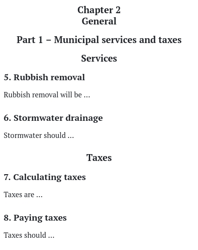 Les chapitres et les parties sont souvent utilisés pour regrouper des sections. Il arrive qu'un chapitre contienne des parties et qu'une partie contienne des chapitres. Les sous-parties ont la même fonction, mais ne comportent généralement qu'un numéro (ou une lettre) et un titre. Les titres transversaux ne regroupent pas les sections et n'ont jamais de numéro ; il s'agit de "titres" autonomes qui ne sont pas privilégiés.