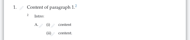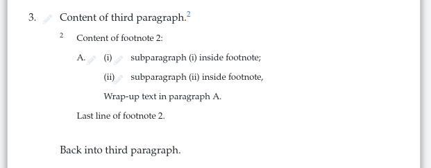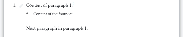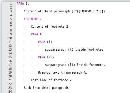 Pour marquer les éléments imbriqués à l'intérieur d'une note de bas de page, utilisez les mêmes principes que pour le marquage de la structure : Indenter le contenu de chaque élément sous son propre mot-clé, et indenter tous les éléments de la note de bas de page sous le mot-clé FOOTNOTE