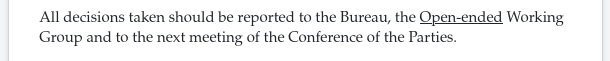 Toutes les décisions prises devraient être communiquées au Bureau, au Groupe de travail {{+ à composition non limitée}} et à la prochaine réunion de la Conférence des Parties.