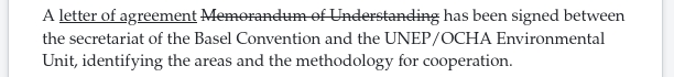 Une {{+ lettre d'accord}} {{- Mémorandum d'accord}} a été signée entre le secrétariat de la Convention de Bâle et l'Unité environnementale du PNUE/OCHA, identifiant les domaines et la méthodologie de coopération.