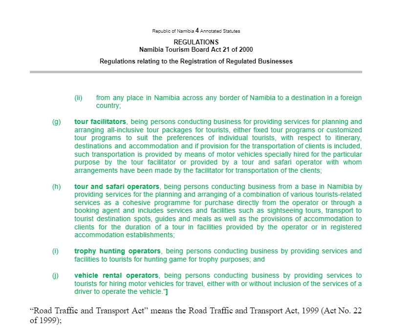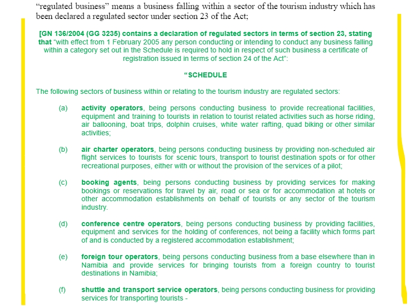 {Les organisateurs de voyages et de safaris, c'est-à-dire les personnes qui exercent leur activité à partir d'une base en Namibie en fournissant des services de planification et d'organisation d'une combinaison de divers services liés au tourisme dans le cadre d'un programme cohérent qui peut être acheté directement auprès de l'organisateur ou par l'intermédiaire d'un agent de réservation, et qui comprend des services et des installations tels que des visites touristiques, le transport vers des lieux de destination touristique, des guides et des repas, ainsi que la fourniture d'un hébergement aux clients pour la durée d'un voyage dans des installations fournies par l'organisateur ou dans des établissements d'hébergement agréés;}}