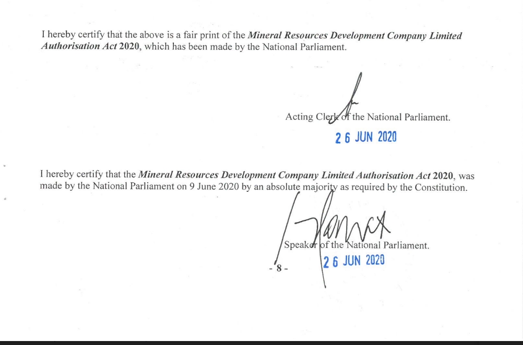 prévoir que les actions de la Mineral Resources Development Company Limited sont détenues en fiducie par le Premier ministre au nom de l'État ; et