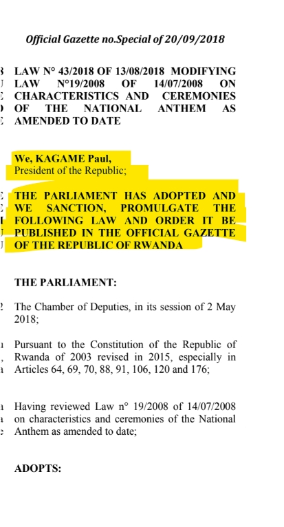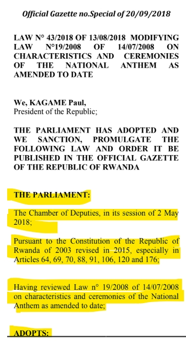 Ayant revu la loi n° 19/2008 du 14/07/2008 portant caractéristiques et cérémonies de l'hymne national telle qu'amendée à ce jour ;