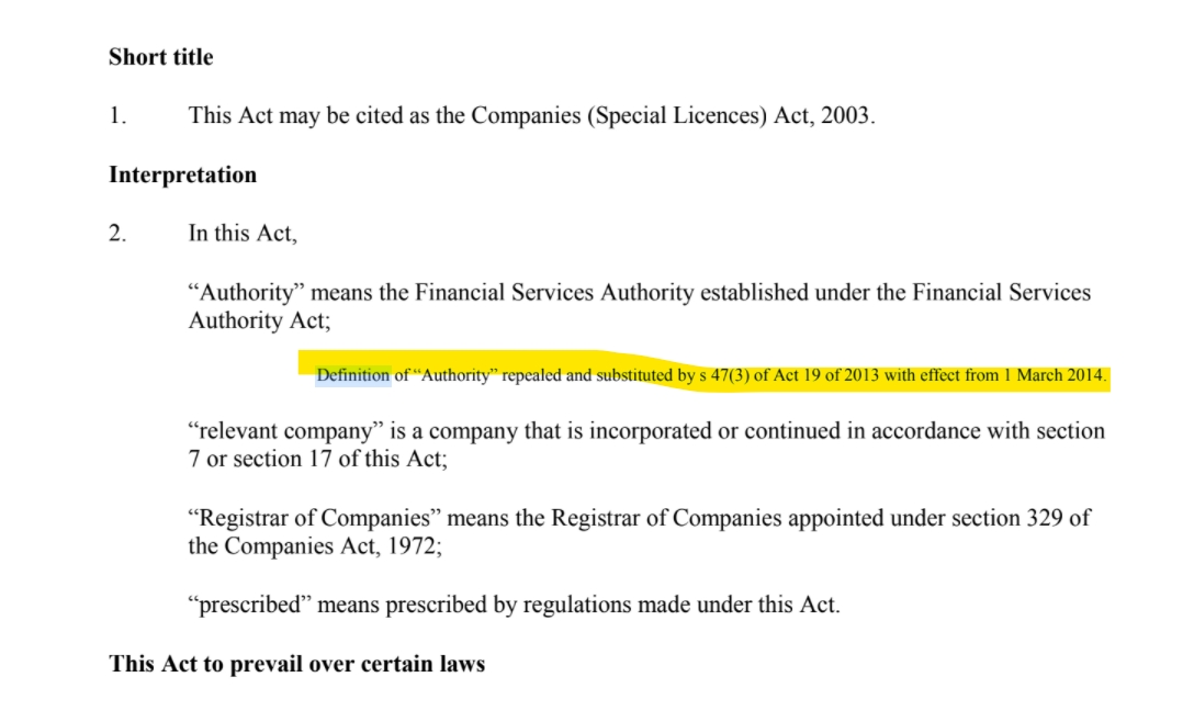 Le texte indiquant les modifications précédentes doit être une annotation. par exemple. {{*[definition de “Autorité” abrogé et remplacé par s 47(3) de L'Acte 19 de 2013 avec effet au 1er mars 2014]}}
