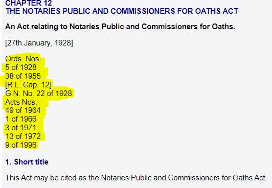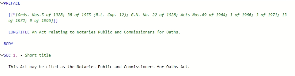 Les références à l’histoire de la législation, comme souligné dans l’image ci-dessous, doivent être capturées dans une seule annotation au-dessus du LONGTITLE. Chaque référence doit être séparée par un point-virgule.