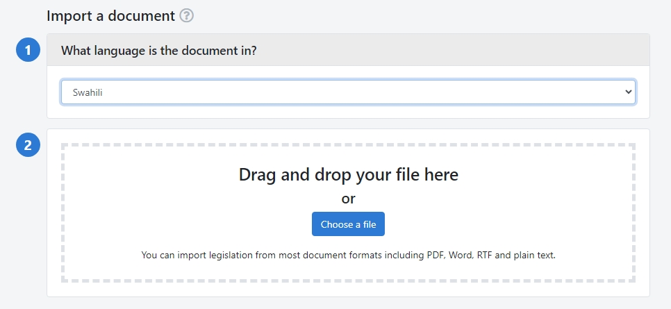 Lors de l'importation de fichiers HTML swahili, la langue (swahili) doit être sélectionnée comme le montre l'image capturée ci-dessous.