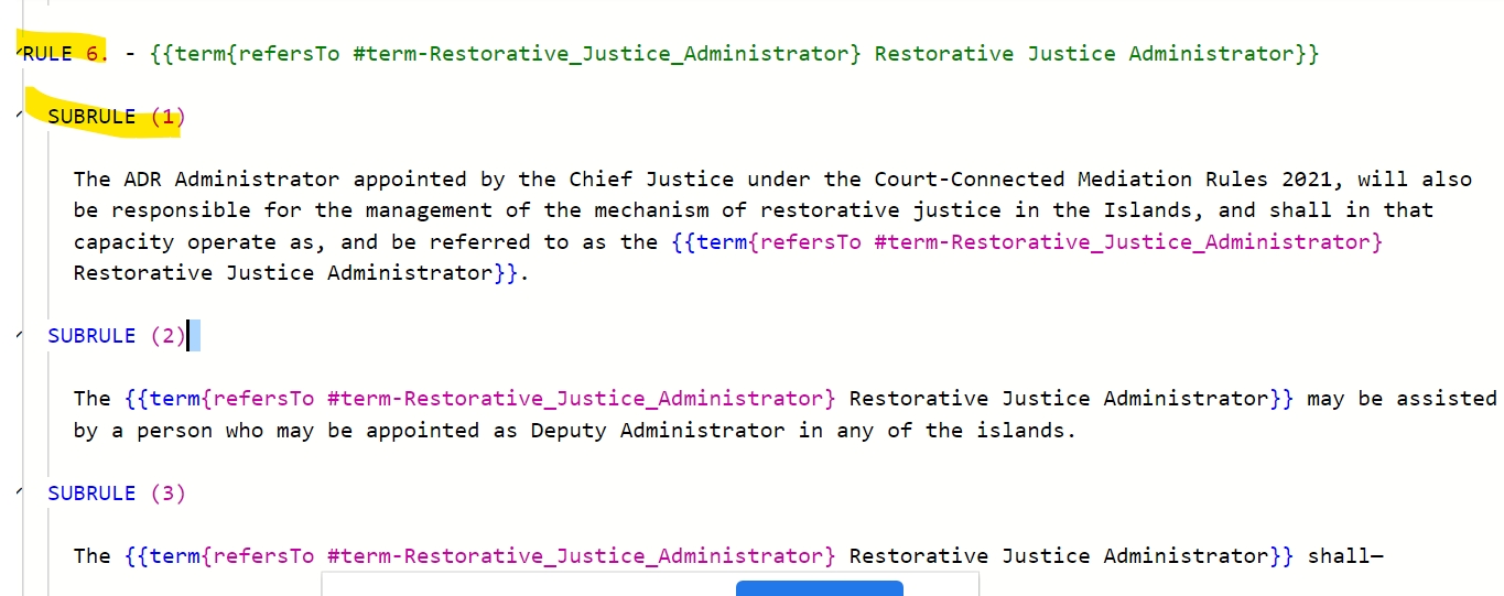 Pour les documents qui sont des règles, veuillez utiliser les mots-clés RÈGLE et SUBRÈLE là où vous utiliseriez autrement SECTION et SOUS-SECTION. Veuillez consulter l'exemple ci-dessous