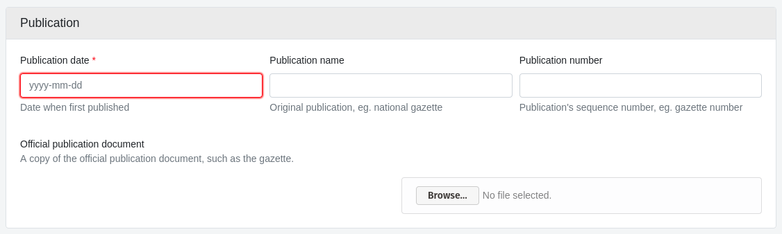 Pour le nom de la publication, utilisez le nom de la publication, par exemple Government Gazette. Choisissez une option dans la liste déroulante, si possible. Dans l'exemple ci-dessous, il s'agit de Eastern Cape Provincial Gazette.