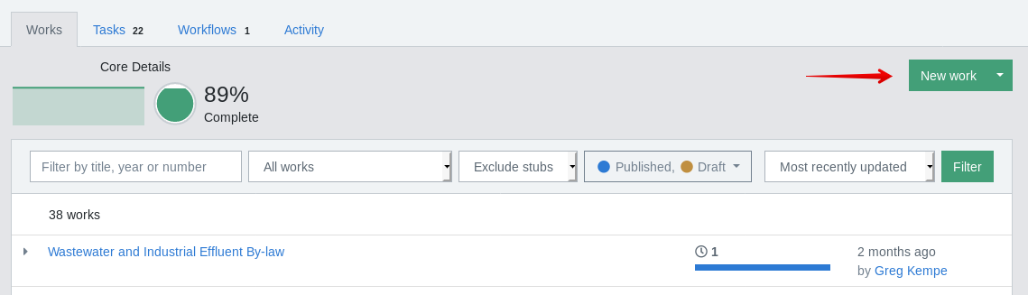Pour créer une nouvelle œuvre, quel que soit son type ou son contenu, ouvrez la page des œuvres pour le lieu approprié et cliquez sur Nouvelle œuvre :
