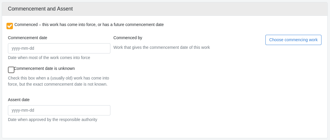 Dans de rares dossiers, lorsque nous travaillons avec une législation plus ancienne, nous pouvons avoir de bonnes raisons de penser qu'une œuvre est en vigueur depuis un certain temps, mais nous recherchons toujours le début des travaux pour déterminer la date exacte à laquelle ils ont commencé. Dans ces rares dossiers seulement, cochez la case La date de commencement est inconnue.