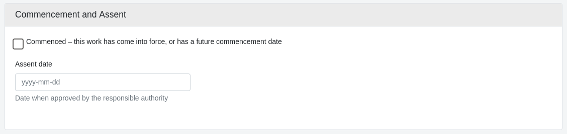À moins que l'ouvrage ne stipule expressément qu'il n'entrera en vigueur que par avis ou proclamation, cochez la case Commencé. Vous avez alors la possibilité de saisir la date d'entrée en vigueur.