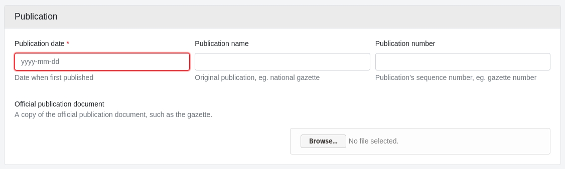 Pour le nom de la publication, utilisez le nom de la publication, par exemple Government Gazette. Choisissez une option dans la liste déroulante, si possible. Dans l'exemple ci-dessous, il s'agit de Eastern Cape Provincial Gazette.