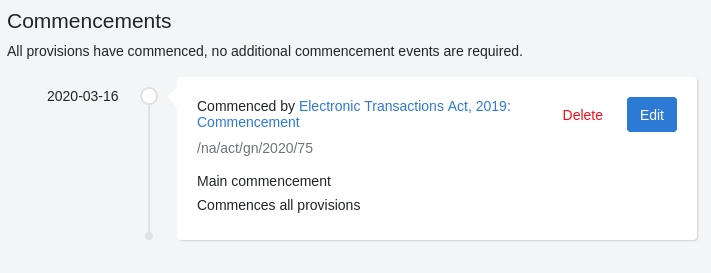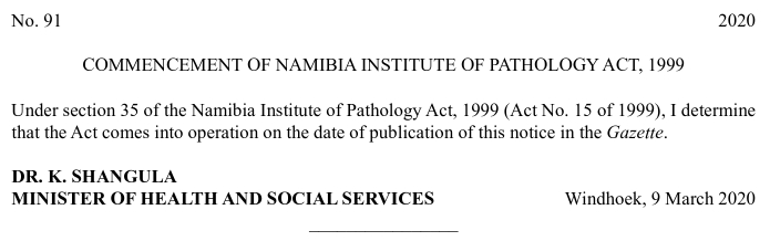 Pour le titre, utilisez le nom de l'ouvrage principal et ajoutez " : Commencement". Par exemple, "Loi de 1999 sur l'Institut de pathologie de Namibie : Commencement".