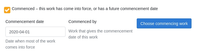 Parfois, la section "Titre abrégé et commencement" ou "Commencement" de l'ouvrage précise une date de commencement (les ouvrages financiers indiquent souvent le 1er avril ou le 1er juillet comme date de commencement).