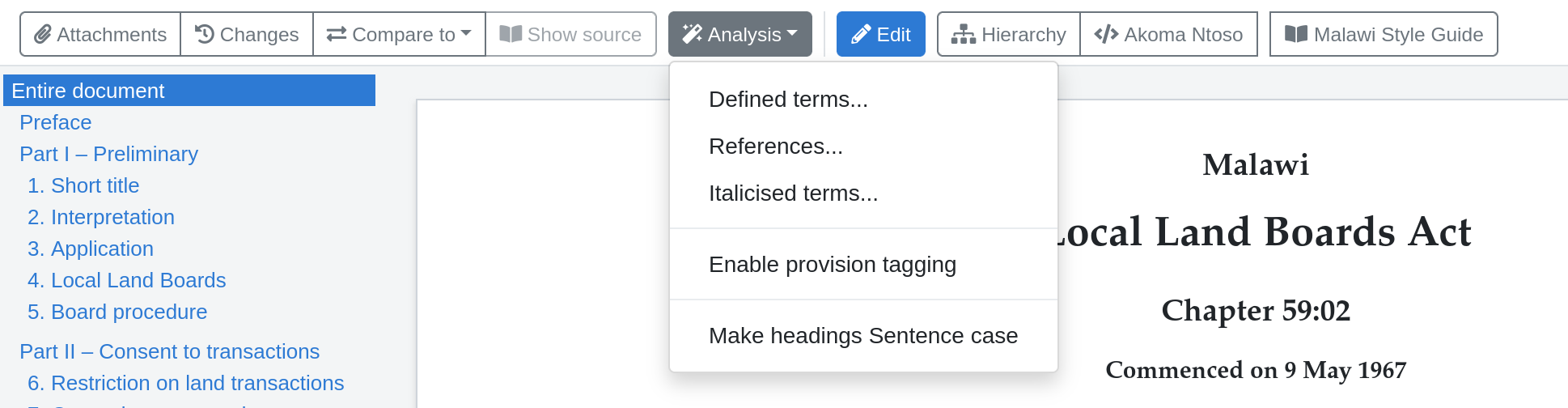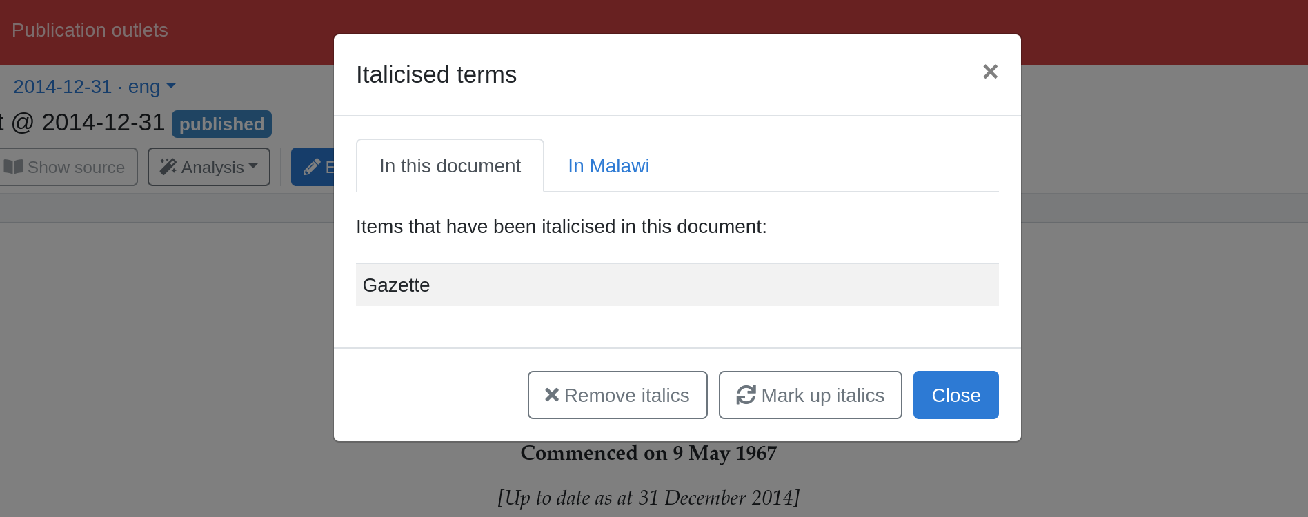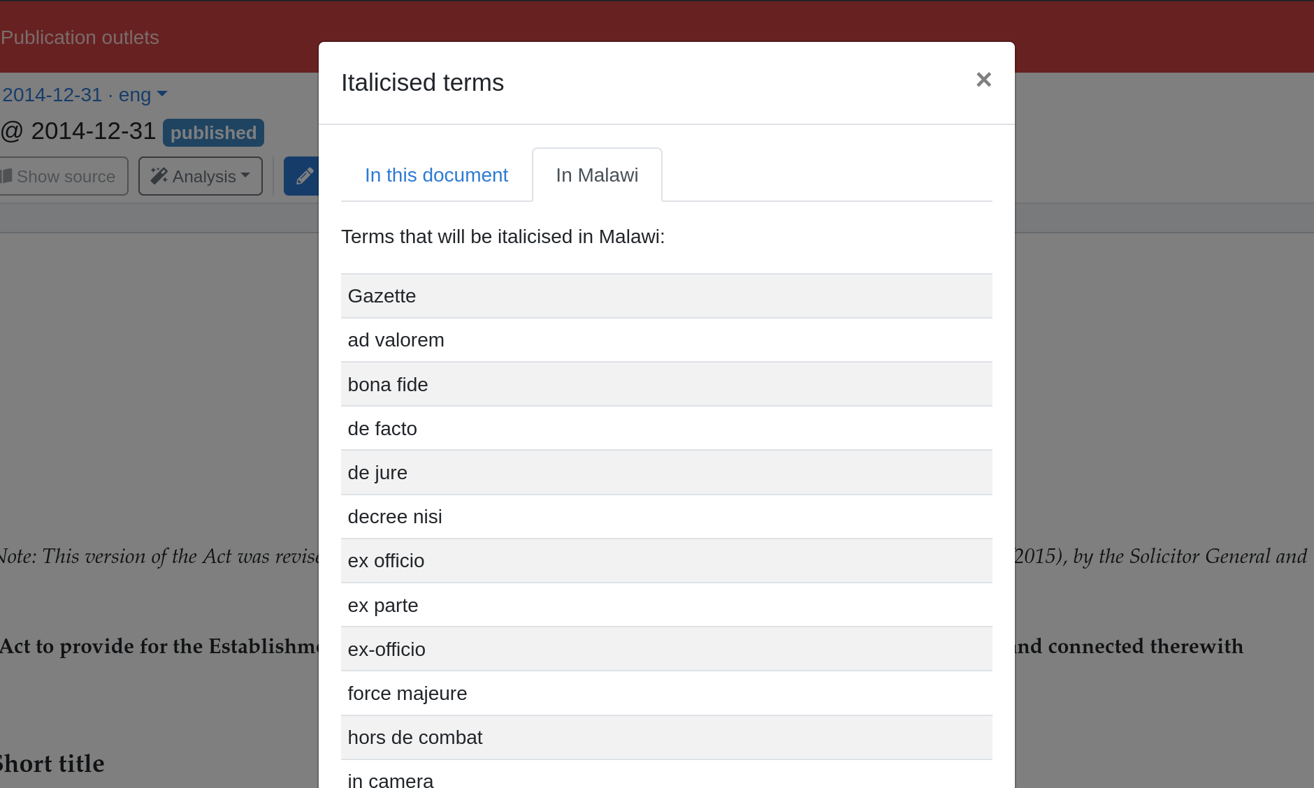 Laws.Africa recherchera automatiquement dans le document la liste standard des termes en italique pour le pays actuel et les mettra en italique.