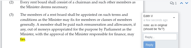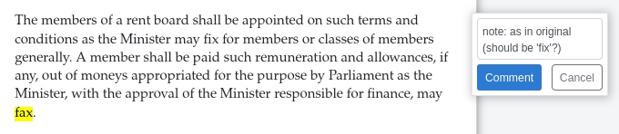 Pour les fautes de frappe ou de grammaire qui ont probablement une correction, mais dont nous ne pouvons être complètement sûrs sans vérifier auprès des rédacteurs de la législation, nous faisons le commentaire suivant :