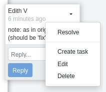 Vous pouvez répondre aux commentaires, créer des tâches à partir de ceux-ci et s'il s'agit de votre propre commentaire, vous pouvez le résoudre ou le supprimer.