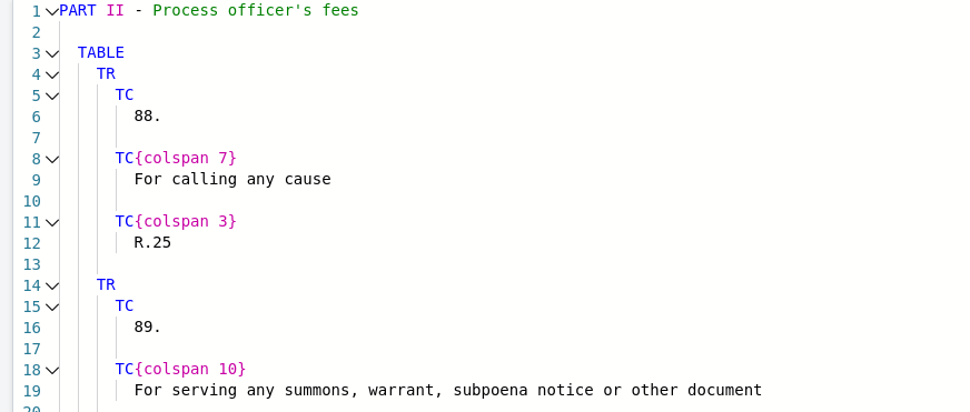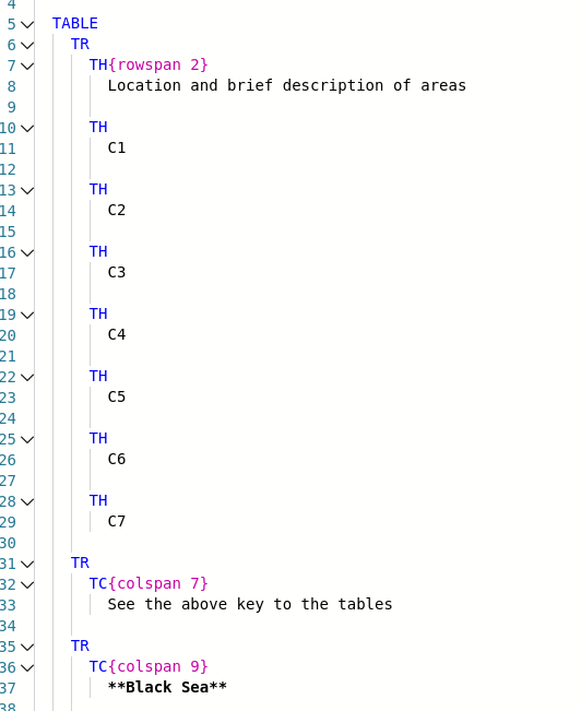 First, it's important to note that some cells in the table legitimately span columns: some span all three columns, and a few span only the second and third column.