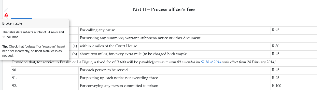 The 'Broken table' error will tell you what the system thinks the total rows and columns for the table are.