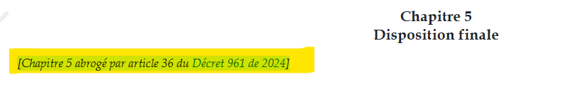 &#x20;**When there are no Titles (Titres) and an entire Chapter (Chapitre) is repealed** which includes Sections and Articles, remove these from the work, leave in the Chapter heading and put one consolidated annotation under the Chapter. Do not use \*\*\* for repealed provisions.