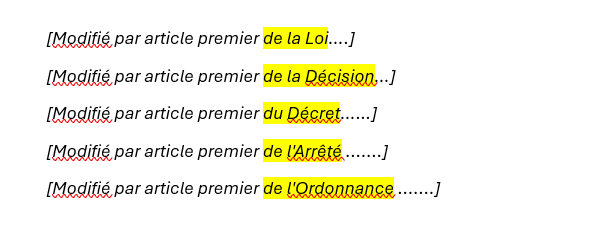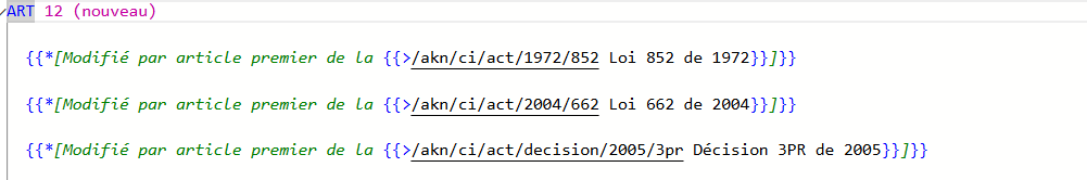 **Where an article is amended, or substituted several times**, create separate annotations for each amendment, each on a new line. Use the verb **Modifié**